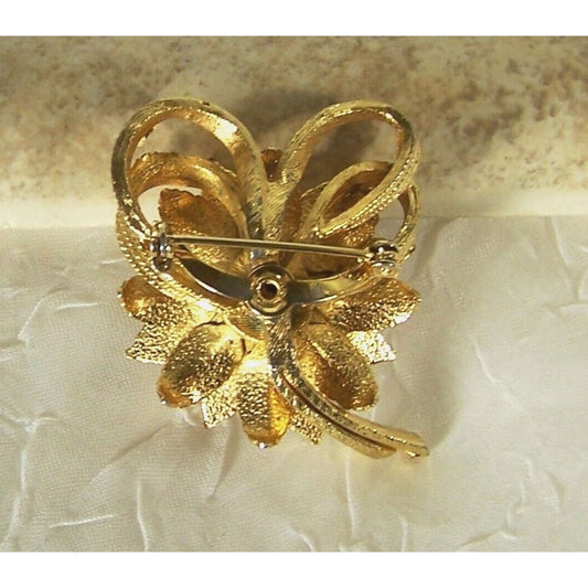 Vintage Gold Tone Rose Flower Brooch Textured Pointed Leaves 2"